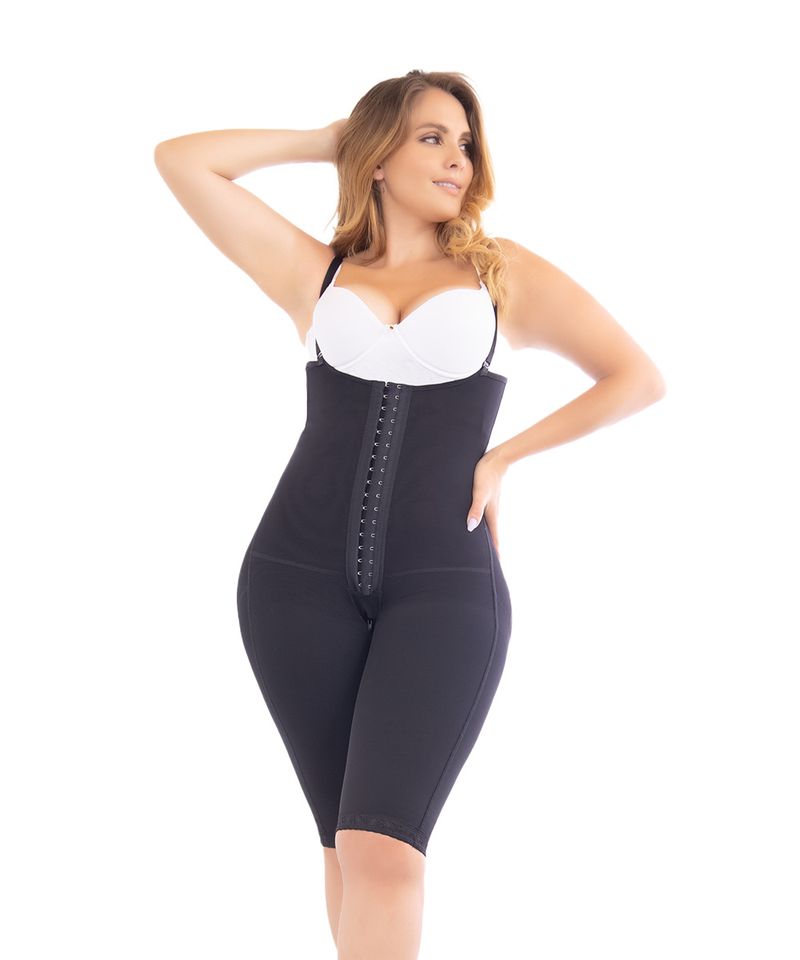 Faja Busto Libre con cargaderas ajustables, diseñada para moldear abdomen, cintura, espalda, muslos y glúteos. Su doble refuerzo abdominal brinda alta compresión, mientras la abrochadura de dos niveles y cremallera perineal aseguran comodidad durante el uso.
