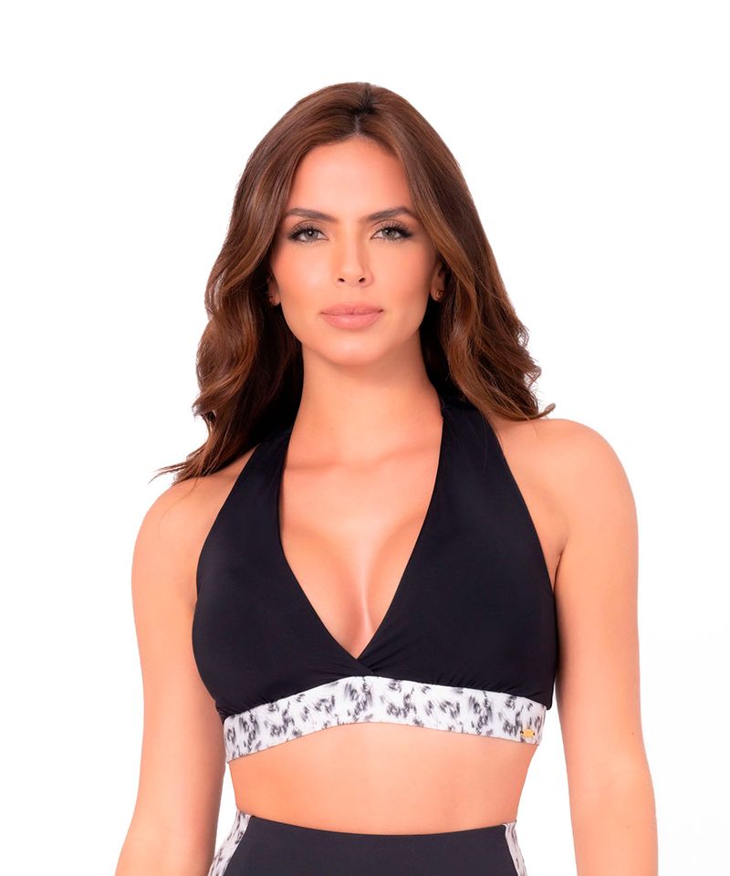 El top bikini en negro, con base estampada, es la elección ideal para un estilo versátil y atractivo. Su escote en V y copas removibles ofrecen un ajuste personalizado, mientras que la base con elástico ancho proporciona el soporte necesario para sentirte cómoda y segura.
