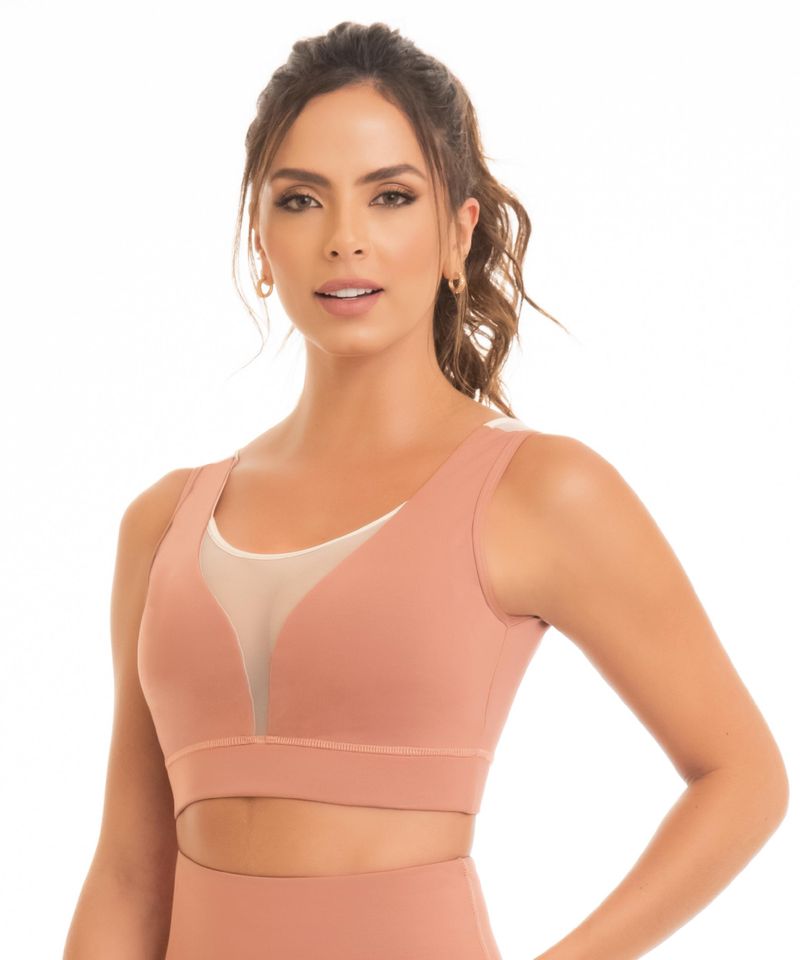 Top deportivo con copas internas que ofrecen soporte y realce natural al busto. Su diseño incluye una espalda ancha para mayor control y un escote con malla que agrega un toque moderno.